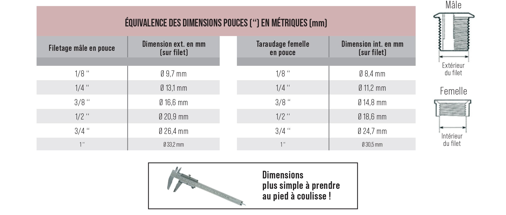 Tableau d’équivalence unité anglaise pouce en unité métrique millimètre :