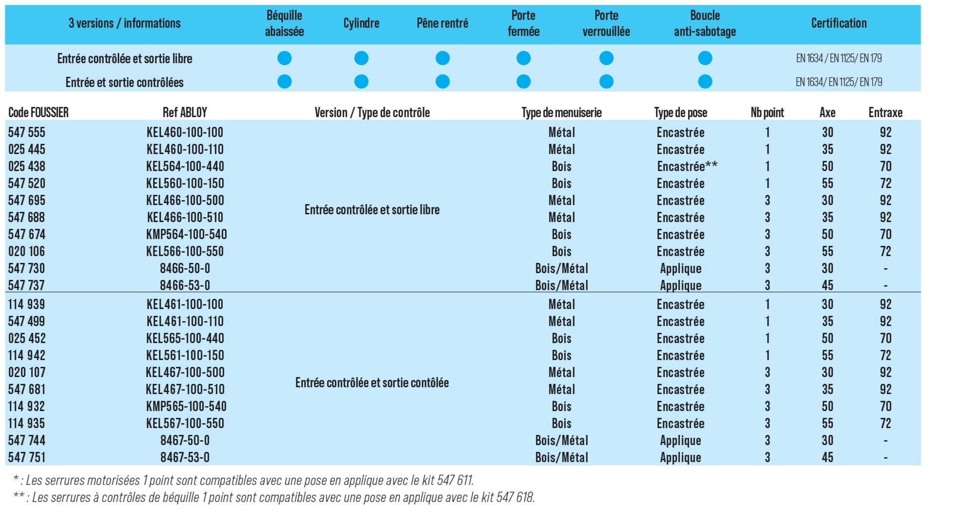 Serrures à contrôle de béquille pour tout type de porte ou d’usage, en version monopoint et multipoint. Celle-ci inclut également des serrures avec des fonctions de contrôle de la béquille extérieure et permettant la sortie libre par la béquille intérieure.