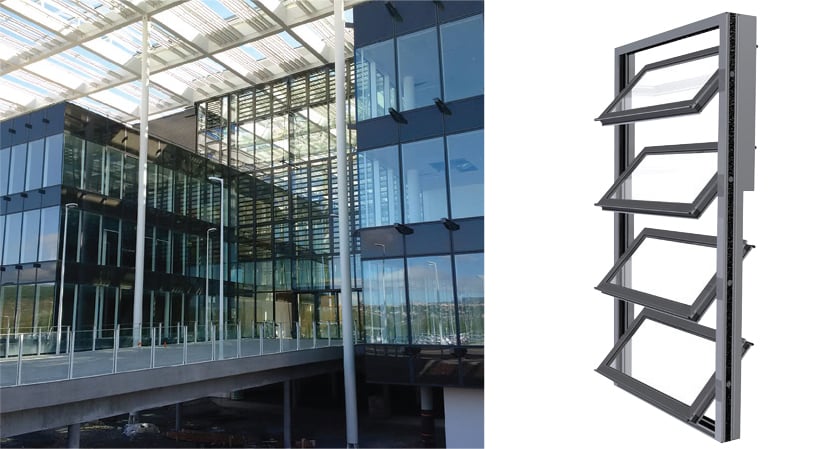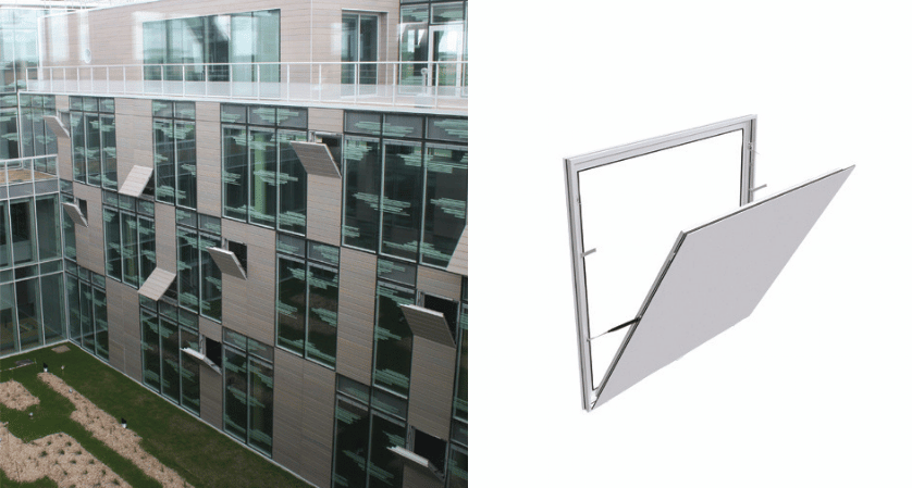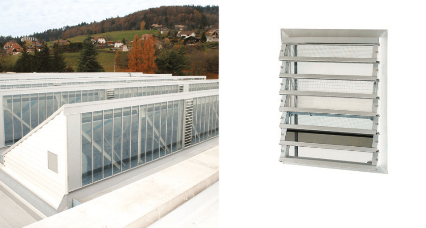 Le désenfumage naturel utilise à la fois des amenées d'air basses (façades) et des évacuations de fumées hautes (façades et/ou toitures).