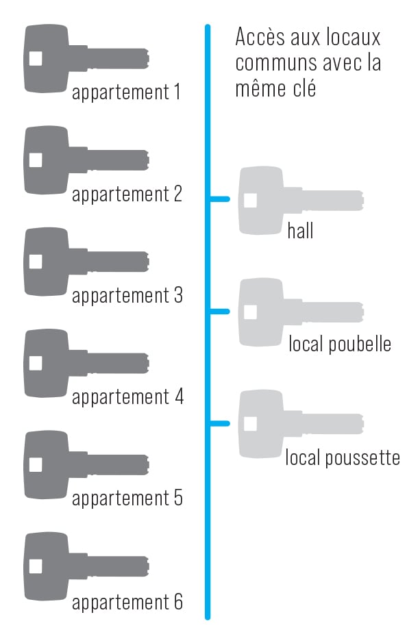 Une clé peut ouvrir différents cylindres qui n’ont pas le même numéro que la clé. Exemple dans une société. Le Directeur Général peut ouvrir toutes les portes et chaque service (comptabilité, secrétariat, achat…) possède sa propre clé. L’ouverture centrale peut aussi être présente.