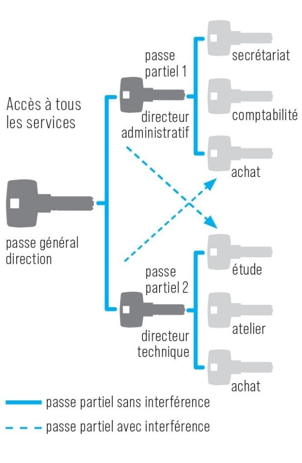Une clé peut ouvrir tous les cylindres. Certaines clés ouvrent uniquement une partie des cylindres. Exemple dans une société avec une organisation plus complexe. Un passe général pour la direction (accès à toutes les portes). Un passe partiel par étage pour chaque directeur de services. L’ouverture centrale peut aussi être présente.