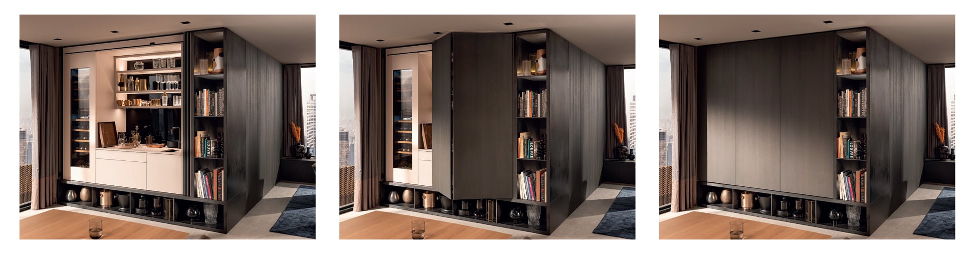 REVEGO est le système unique de porte coulissante pour les applications portes simple et double, dont la technique est entièrement intégrée dans un corps de meuble étroit spécialement dédié, la Pocket.