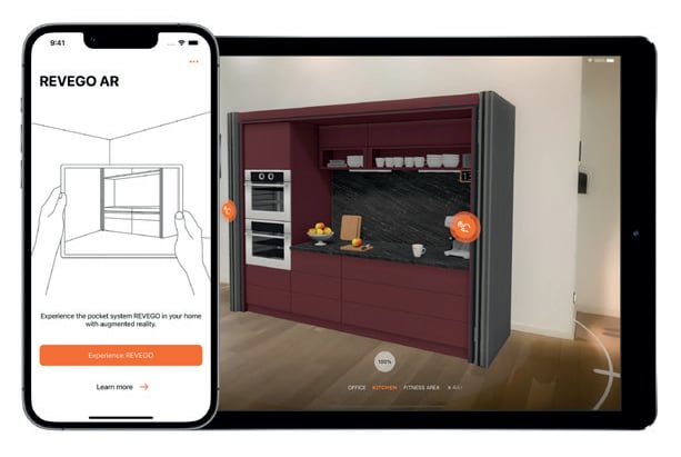 REVEGO AR, disponible sur Apple Store. Désormais, avec un iPhone ou un iPad, vos clients peuvent placer un REVEGO dans l’espace et toucher le réel du bout des doigts !